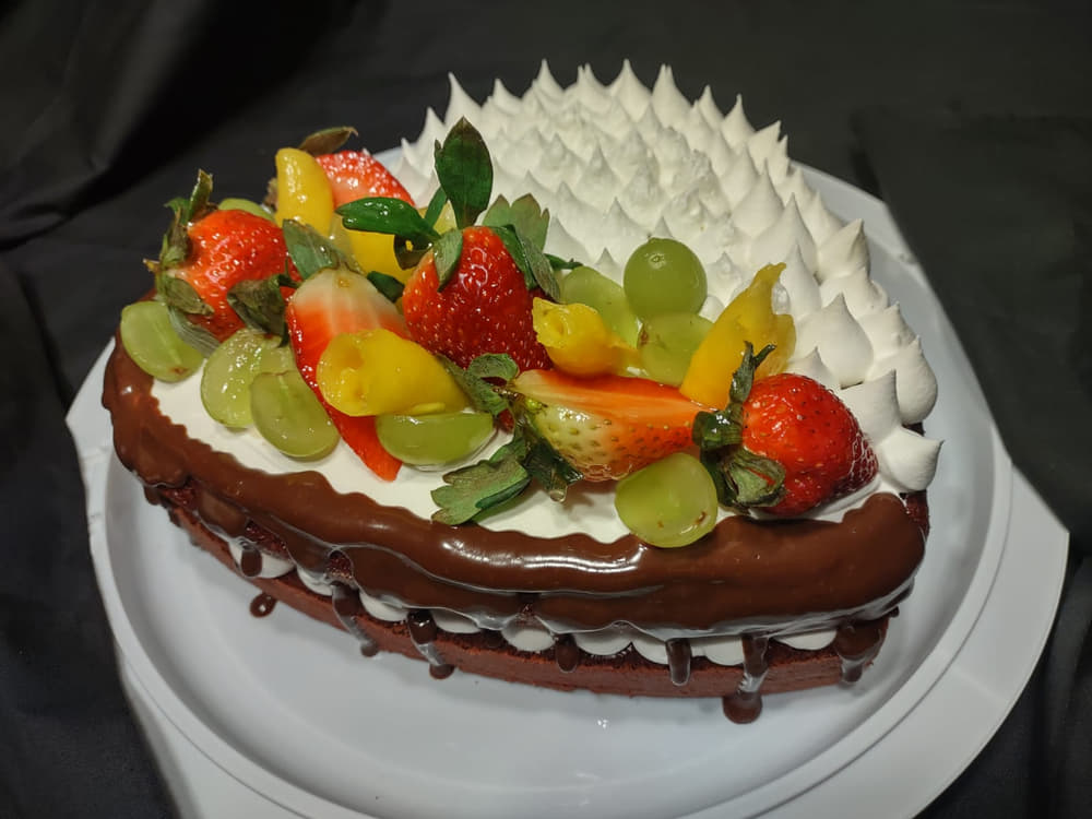 No eres muy amante de lo dulce, bueno este delicioso pastel es perfecto; El pan es sabor chocolate puedes elegir el relleno entre fresa fresca o durazno con un poco de betún, no hay betún alrededor solo encima y prácticamente sólo la mitad porque la otra mitad lleva fruta de temporada sobre chocolate chorreado. (Entre 10 a 12 porciones)