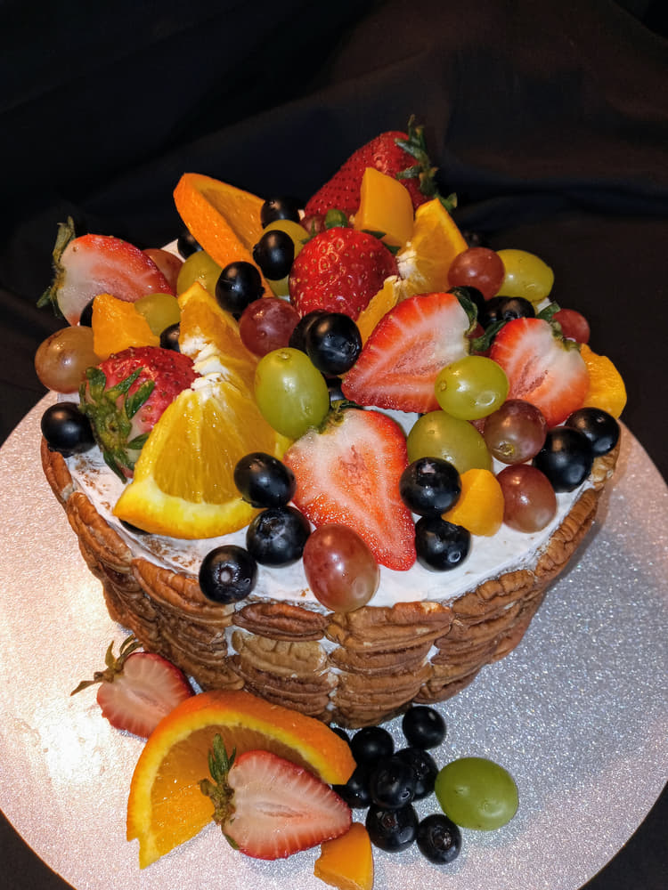¿Te gusta la nuez? ¡Este pastel tiene nuez y mucha! Decorado con nuez y fruta de temporada, te encantará! (Entre 8 a 10 porciones).