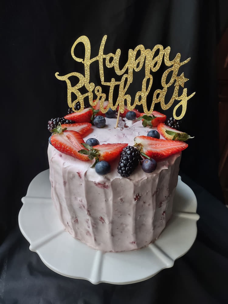 ¡Simplemente rico! Decorado con fresa fresca en el betún y relleno de fresa, sólo puedes agregar... ¡Feliz Cumpleaños! decorado con fresas y capulines (blueberry.) (Entre 10 a 12 porciones)