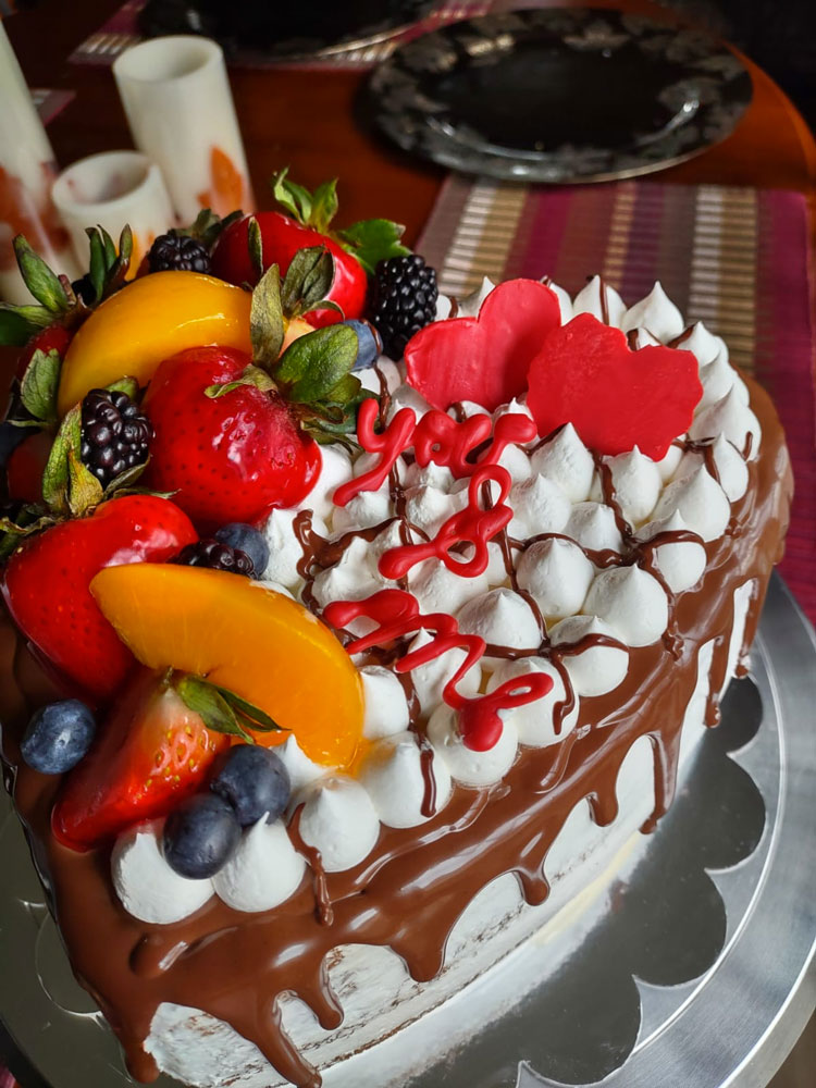 Pastel "desnudo" con chocolate encima y fruta de temporada, puedes elegir el pan; Vainilla o chocolate. (Entre 6 a 8 porciones)